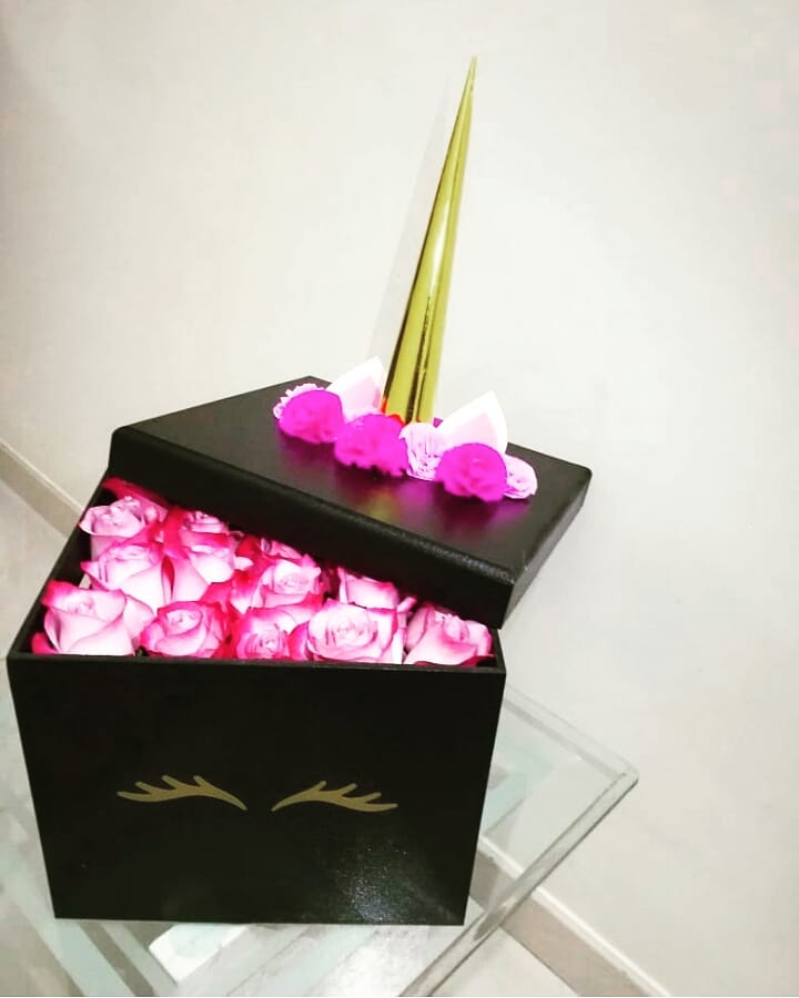 CAJA COLOR NEGRO CON LA TEMÁTICA DE UNICORNIO.